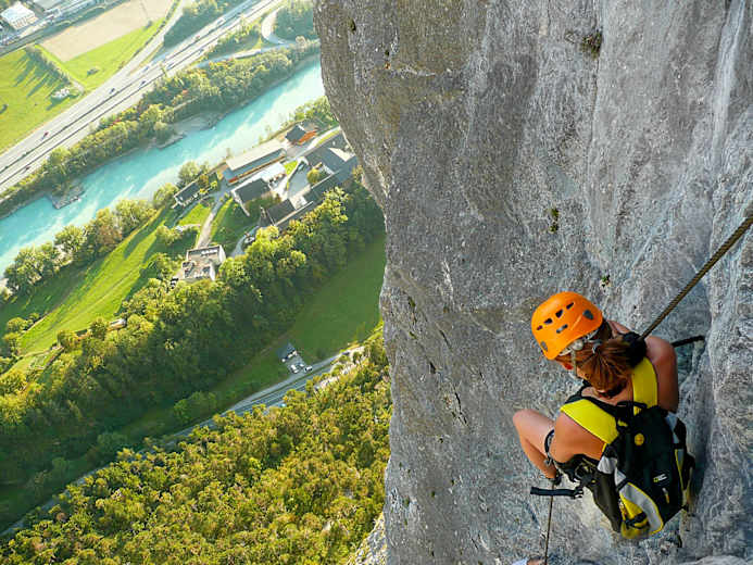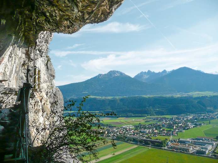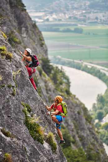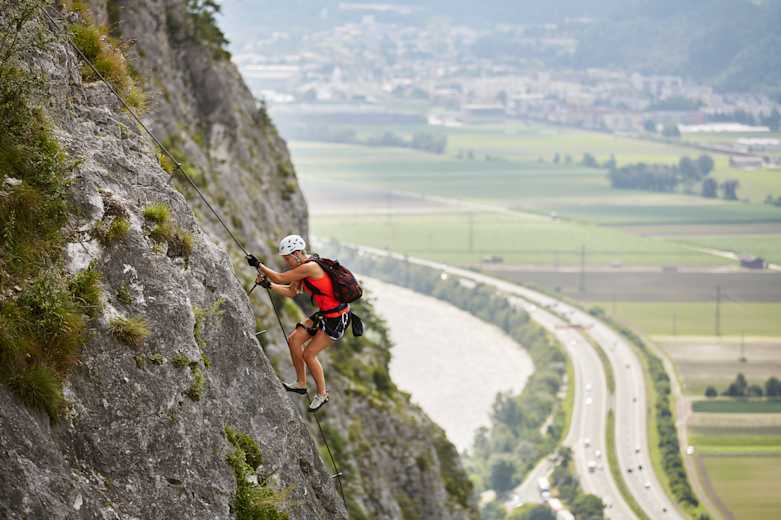 Der Kaiser-Max-Klettersteig durch die Martinswand westlich von Innsbruck besticht durch seine senkrechten langen Wandelemente, die spektakuläre Routenführung und die grandiose Aussicht.