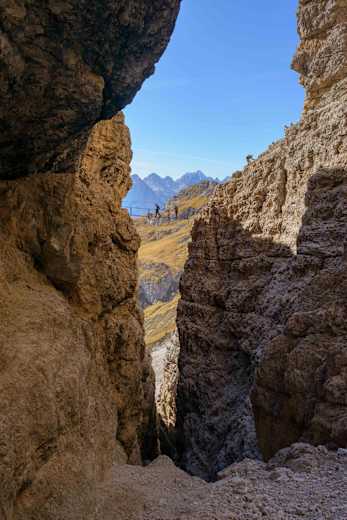 Beim Biwak A. T. De Toni angekommen, folgt man in nordwestlicher Richtung dem Alpinisteig 1915/1918. Die Besonderheit bei diesem Abschnitt: er führt über eine Gebirgstreppe, die vor 100 Jahren angelegt wurde zur Büllelejochütte.
