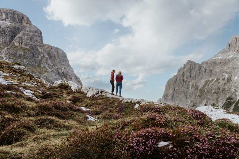 Auf dem Weg 101 und dem Dolomitenweg 9 wandert man zum Schluss gemütlich abwärts zur Zsigmondyhütte auf 2.224 m.