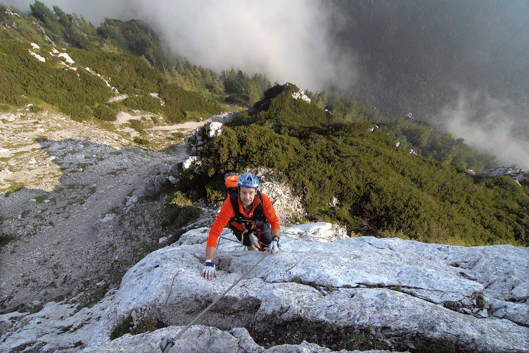 Entlang der Schotterstraße durch den Wald, an der „Moaralm“ vorbei (842 m; 45 Min., Abzweig zum Steinernen Jäger und nun mit geringerer Steigung bis zu einer Lichtung (924 m; 15 Min.; MTB-Parkplatz). Scharf links (Wegweiser) abzweigen und kurz darauf in teilweise steilen GeröllSerpentinen zum Einstieg (1.080 m; 30 Min.). Dauer: 1,5 h.