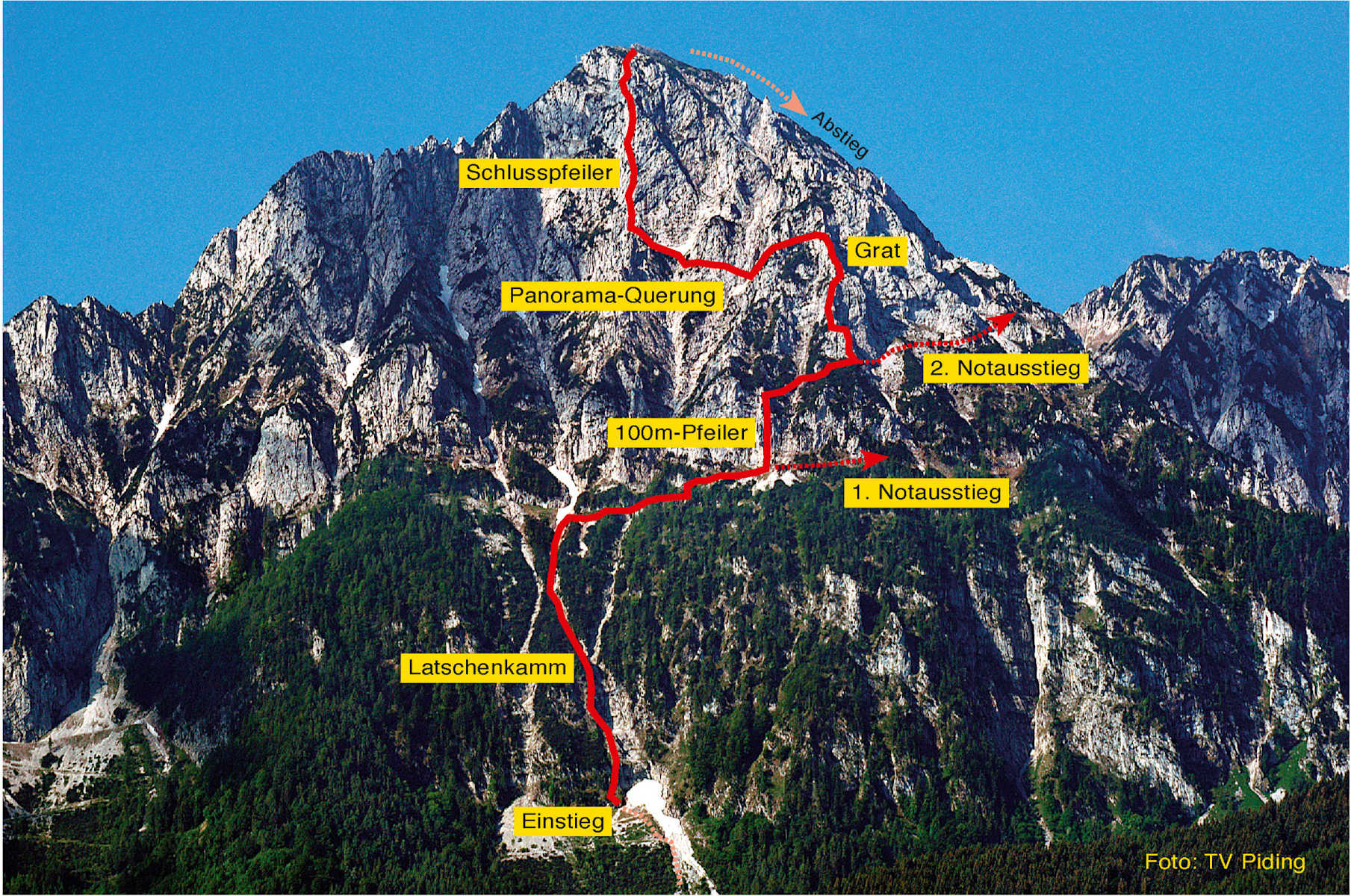 Pidinger-Klettersteig Foto: Kurt Schall, www.schall-verlag.at Pidinger-Klettersteig Foto: Kurt Schall, www.schall-verlag.at Immer wieder ist ordentlich Armkraft gefragt am Pidinger Klettersteig Foto: Schall Verlag Jetzt heißt es durchbeißen Foto: Schall Verlag Magdalena Kalus genießt den Pidinger Klettersteig in den Chiemgauer Alpen Foto: you are an adventure story Übersicht über den Routenverlauf Foto: Schall Verlag Bildergalerie (6)