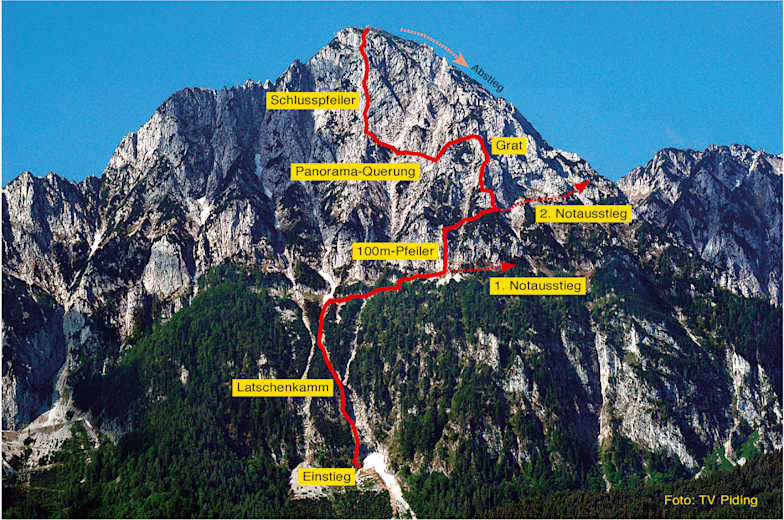Geschickt wird eine natürliche Routenführung genutzt; an den entsprechenden Stellen findet man aber immer wieder Tritthilfen, und zwischendurch laden leichtere Stellen zum Verschnaufen ein. Oben wartet ein fantastisches Panorama auf den Klettersteigler, und das gemütliche Reichenhaller-Haus nahe des Gipfels lädt zum Verweilen ein. Einer der Top-Steige Deutschlands, jedoch nur für erfahrene und trainierte Bergsteiger ein Genuss. Wurde vor wenigen Jahren komplett saniert und der Verlauf teilweise etwas verändert.