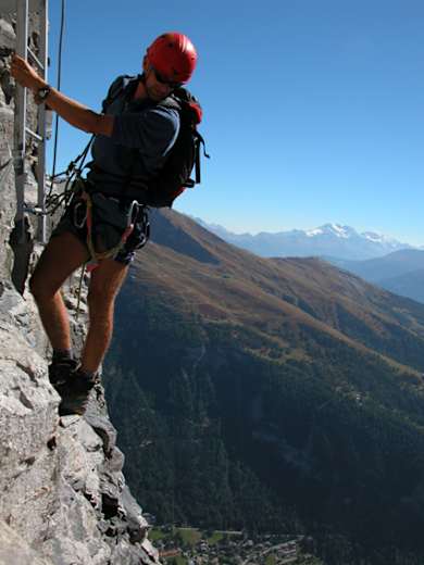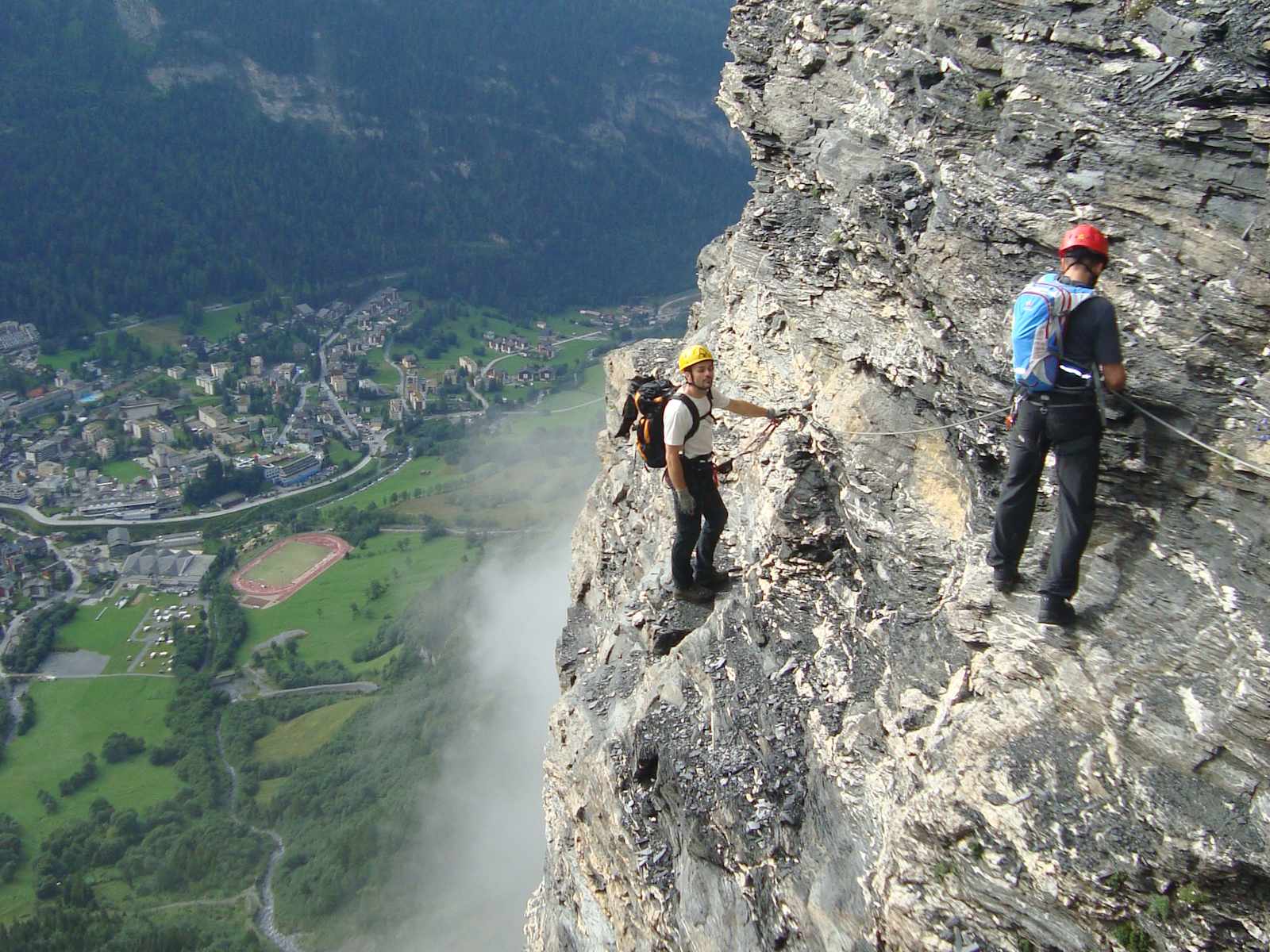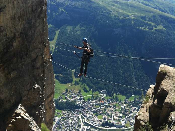 Highlight der Route sind der 100 m lange, höhlenartige Spalt mit Wasserfall und die sogenannte "Via Konst", in der man die imposante Felswand hautnah spüren kann. Eine Via Ferrata für erfahrene Klettersteiggeher, die einem das einmalige Panorama der Walliser Alpen auf eindrückliche Art und Weise näher bringt.
