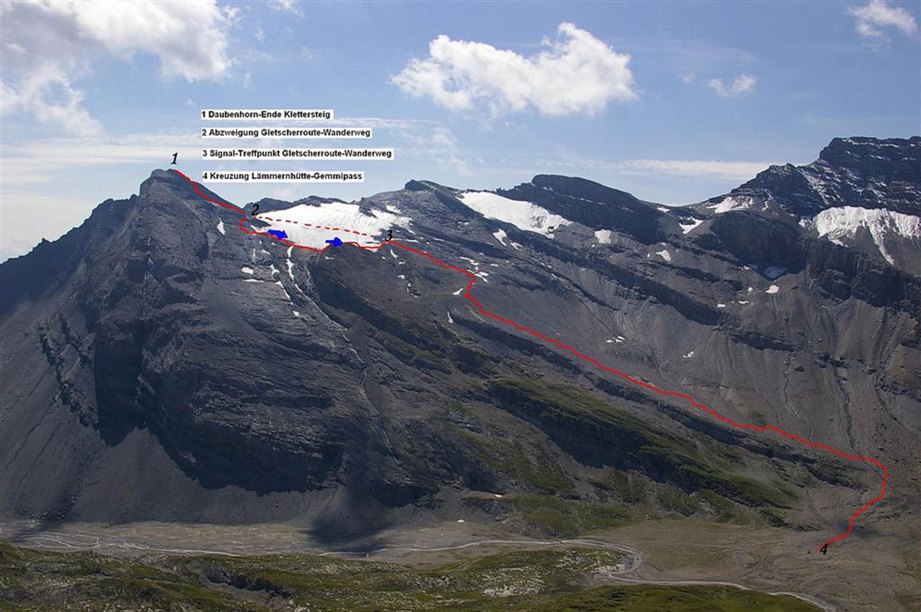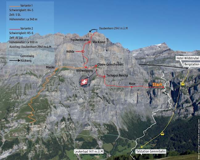 Routenverlauf Foto: Verein IG Klettersteig - Klettersteig Gemmi-Daubenhorn-Leukerbad Daubenhorn Klettersteig Foto: Leukerbad Tourismus Daubenhorn Klettersteig Foto: Leukerbad Tourismus Daubenhorn Klettersteig Foto: Leukerbad Tourismus