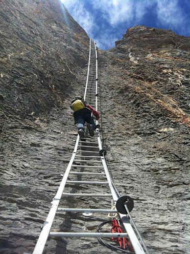 Über zahlreiche Leitern erreicht man die "Obere Freiheit". Hier besteht bei schlechtem Wetter oder mangelnder Fitness die Möglichkeit über einen gesicherten Steig (B/C) nach Leukerbad abzusteigen.