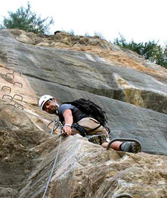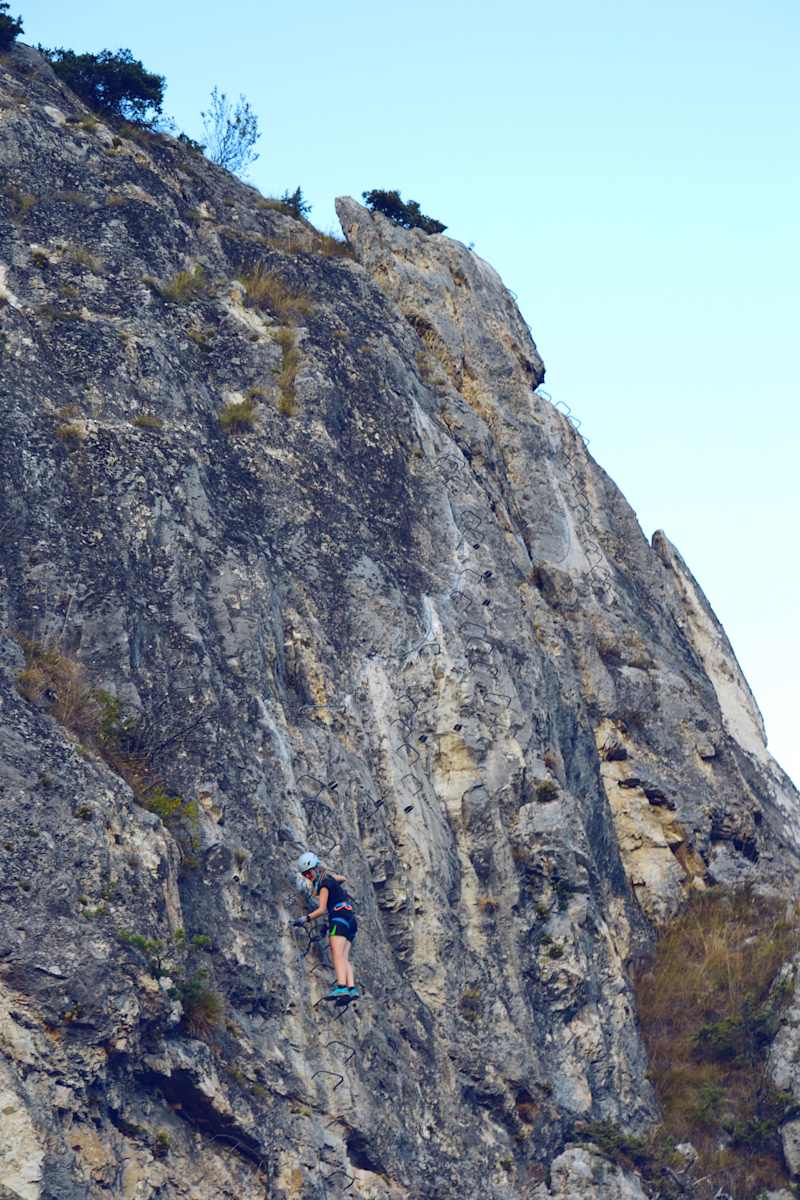 Etwa auf der Hälfte des Klettersteiges befindet sich ein Notausstieg. Wenig später klettert man erst über eine Felsnase dann auf dem Nordwestgrat zum Ausstieg auf 1.220 m.