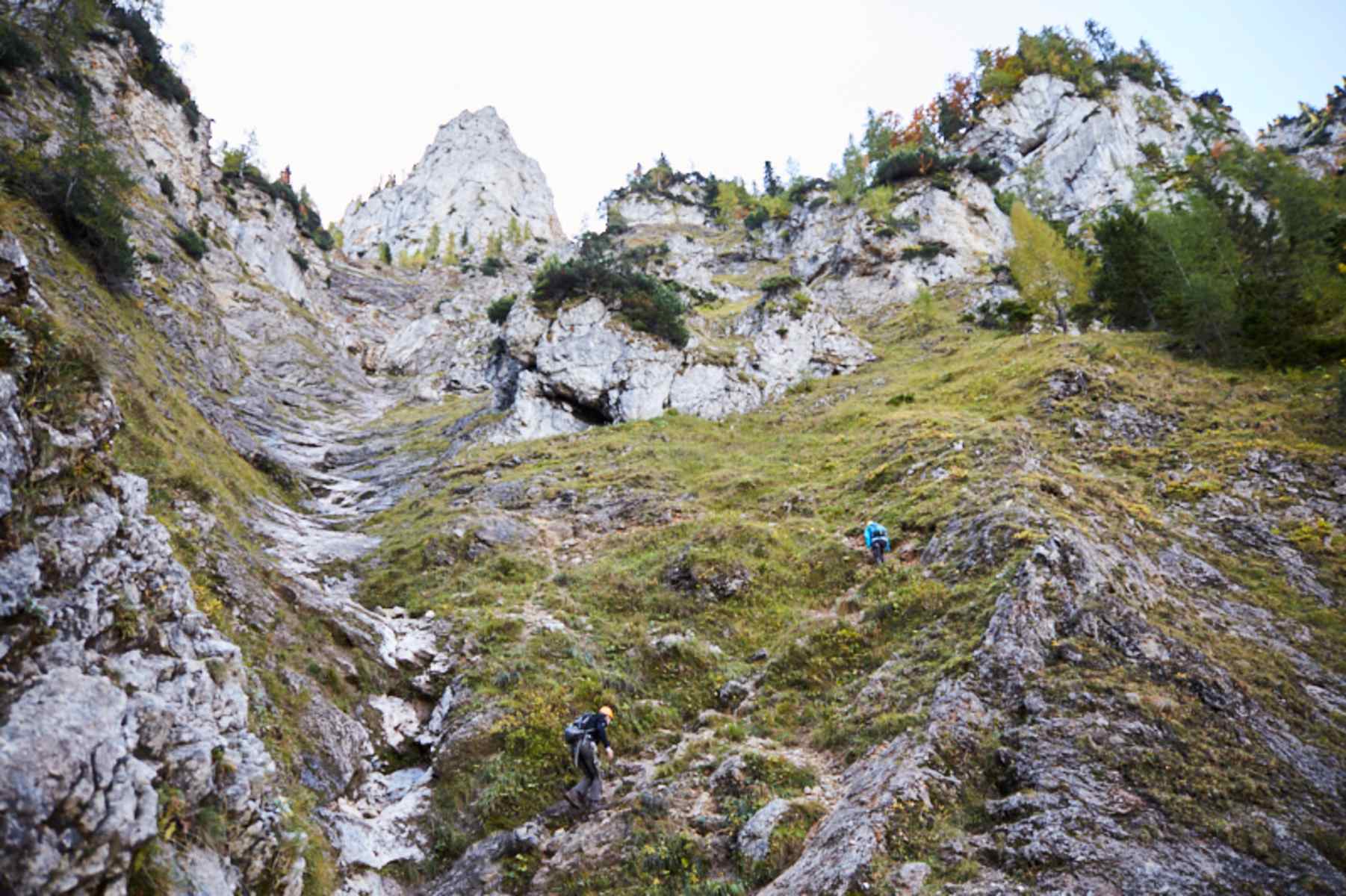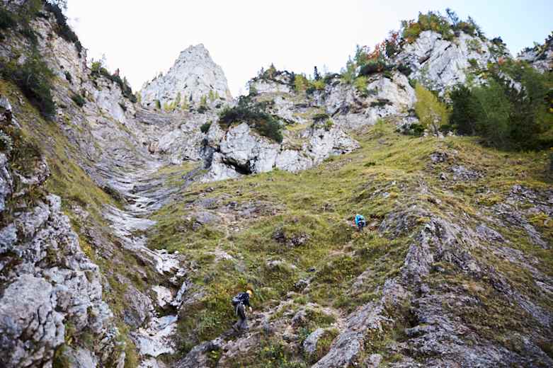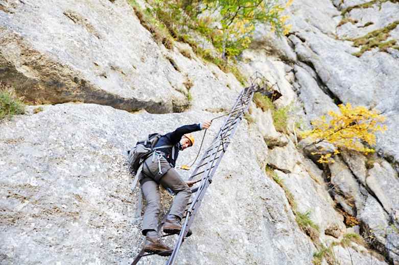 Entlang deutlicher Steigspuren linkshaltend (blasse, blaue Markierungen) zu den Geröllfeldern und über diese in Kürze zum Einstieg (Tafel; markante, verbogene Leitern). Dauer 1,5 h und 420 Hm.