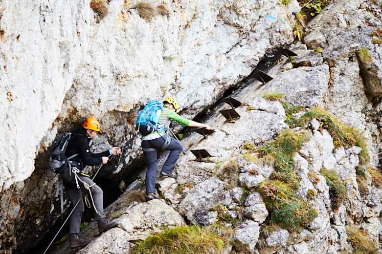 Im Frühsommer zusätzlich zur üblichen Klettersteigausrüstung eventuell Pickel und Steigeisen für die steilen Rinnenquerungen mitnehmen.