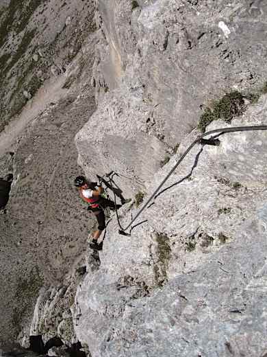 Mit vielen Kehren im steilen Wald aufwärts zur Baumgrenze und dem Geröllsteig weiter folgen unter die Wandabbrüche. Eine rampenartige Rinne (tw. gesichert, A) führt nun linkshaltend steil aufwärts. Nach dieser erreicht man einen kleinen Sattel mit einem markanten, spitzen Felszacken (ab hier große Steinschlaggefahr durch Klettersteigbegeher - Helm aufsetzen!).