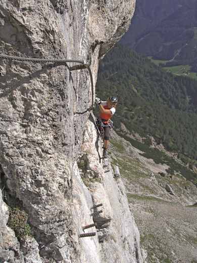 Exposition Südwest; sehr gut gesichert: durchgehendes Stahlseil, Tritt- und Griffstifte, Stahlseilbrücke; kein Fluchtmöglichkeiten; geeignet für Kinder über 14. Jahren.