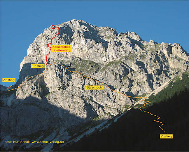 Kurz bergab und entlang des Wandfußes dem Stahlseil (A) folgen bis zu dessen Ende. Kurz danach befindet sich der Einstieg zum Kaiserschild-Klettersteig (Tafel; ca. 50 m nach dem kleinem Sattel). Dauer 1,5 und 670 Hm.