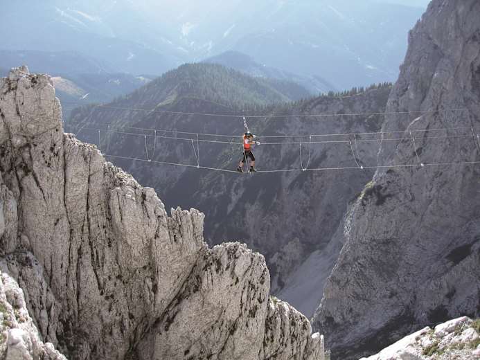 Klettersteigset, Helm, mittelfeste Bergschuhe oder Kletterschuhe; Verlängerung für die „Nepalbrücke“.