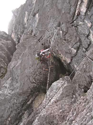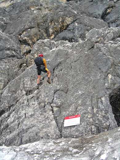 Einige Klettersteiggeher verwenden für den Einstieg Kletterschuhe. - Für alle die sich sonst schwer tun, keine schlechte Idee.