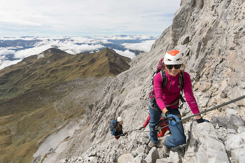 Klettersteig-Set, Klettergurt, Anseilgurt, Kletterhelm, Berg- oder Wanderschuhe, geeignete Kleidung und Handschuhe.
