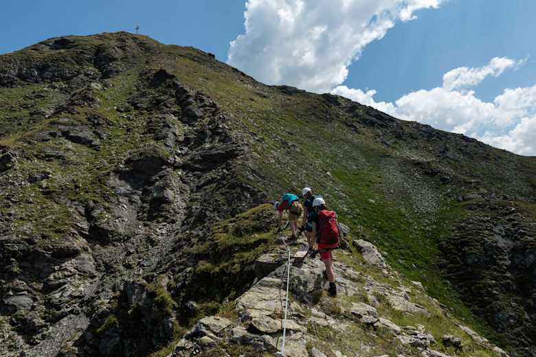 Gleich das erste Stück des Klettersteiges führt senkrecht nach oben. Zwar ist das Stück mit Eisenklammern entschärft, aber wer hier schon Probleme hat, sollte lieber umdrehen, denn entlang des Klettersteiges gibt es keine Ausstiegsmöglichkeit. Weiter in der Schwierigkeit B/C passiert man den ersten luftigen Quergang, klettert plattig nach oben und über Klammern (C) weiter aufwärts. Bald darauf ist ein luftiges Eck zu umgehen (B/C), bevor es über einen Grasabsatz und eine erdige Stelle (A) weiter geht. Über Leisten, Platten und eine Felsspitze erreicht man eine markante Kante. Hier geht es nun links querend weiter, zum Teil wieder über erdige Passagen. Es folgt eine steile C/D Stelle, die hinauf zu einer erdigen Schulter leitet. Die folgende senkrechte Wand ist durchgehend im Schwierigkeitsgrad C zu klettern, dafür wartet danach eine Bank zum Ausrasten. Über eine Schulter, einen Felskopf und eine gestufte Plattenwand erreicht man wieder einen markanten Felskopf. Hier folgt nun eine sehr lufigte Querung (B/C), die zu den letzten Klettersteigmetern führt, die nun relativ leicht (B) zu einem Sattel und damit zum Ausstieg leiten.