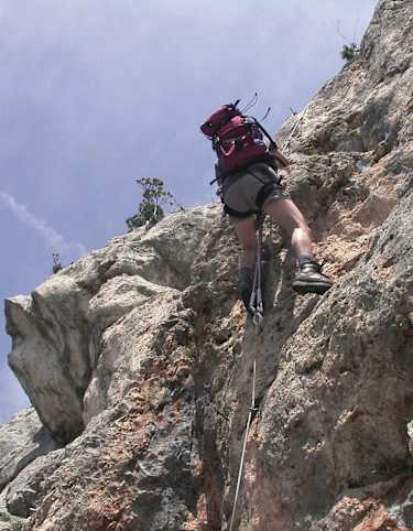 Am Ende der Seilbrücke lädt ein Rastplatz zum Verweilen ein. Es folgt ein kurzes Gehgelände, wo außerdem links der Notausstieg abzweigt. Man kommt zu einer Platte und erreicht über eine steile Wand - hier wieder C/D - einen Absatz. Es folgt eine Querung in C, die zur Schlüsselstelle, einem Überhang in D, führt. Zum Schluss ist noch eine Wand in C zu bewältigen und dann hat man den Ausstieg erreicht.
