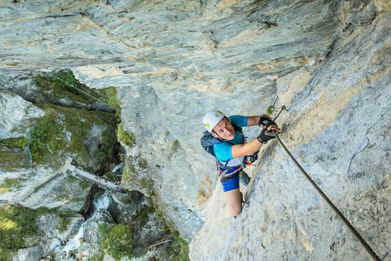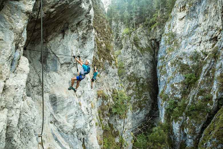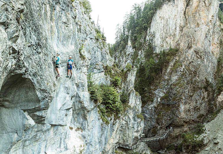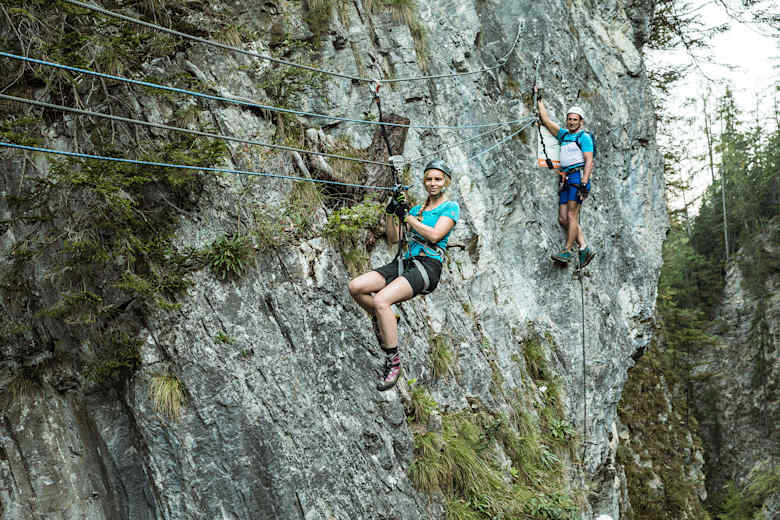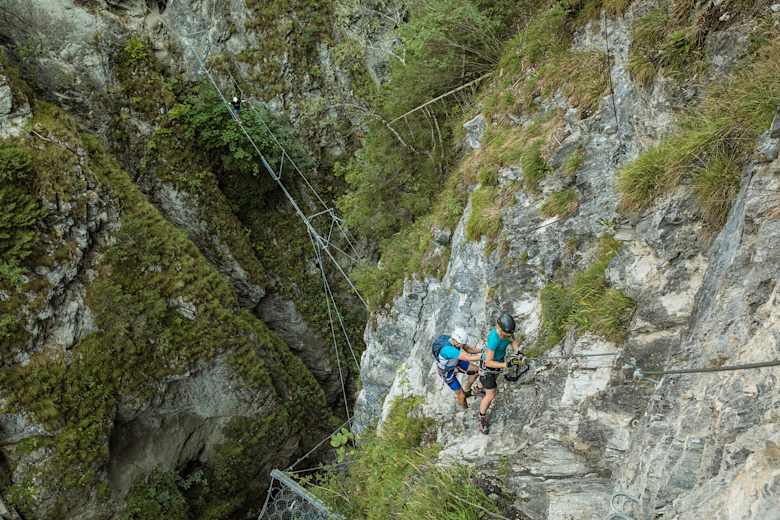 Der Klettersteig beginnt mit einem Quergang über dem wildrauschenden Wasser der Klamm. Danach geht es praktisch ohne Umschweife nach oben. Es gilt, senkrechte Wände und steile Felspfeiler zu überwinden. Einige Stellen im Schwierigkeitsgrad D verlangen Armschmalz und Ausdauer. Im oberen Bereich sollte man dann zudem ein stabiles Nervenkostüm haben, denn hier wird der Steig seinem Namen mehr als gerecht: die überhängende Freifallkante und die Riesenseilbrücke befinden sich atemberaubend hoch über der Schlucht. Alles was hier fällt, fällt komplett frei. Details siehe Topo. Kletterzeit rund 1,5 h.