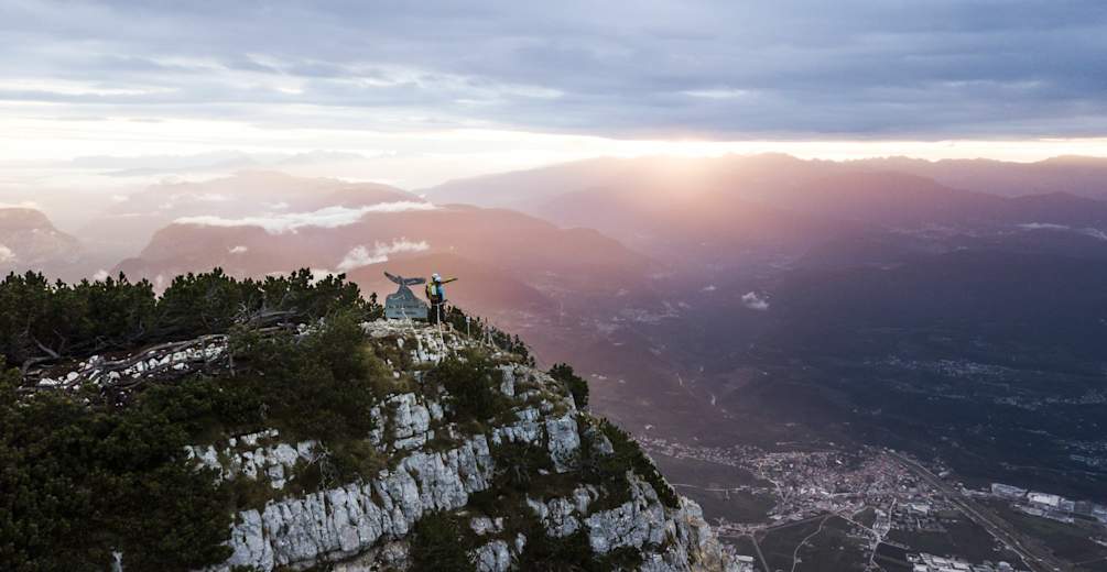 Beim Ausstieg folgt man links an der Felskante den mit „Sentiero delle Aquile" (Adlerweg) beschilderten Weg bis zum Gitterzaun und zur Bergstation des Paganella-Gipfels.
