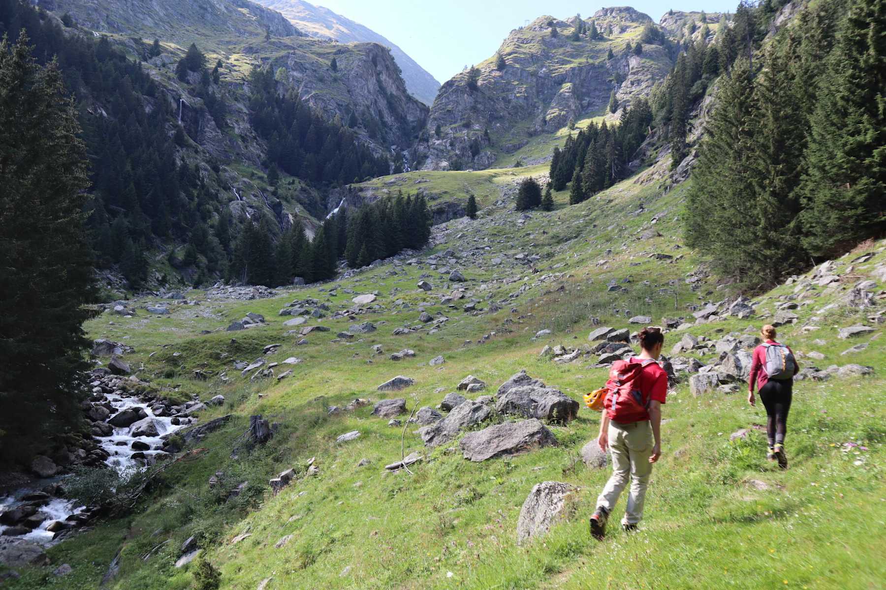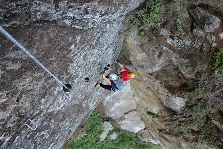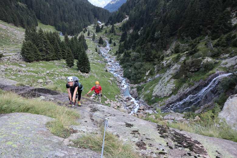 Der Ziel-Klettersteig oberhalb des Partschinser-Wasserfalls im Zieltal folgt dem tosenden Zielbach und führt auf das aussichtsreiche Gingglegg im Naturpark Texelgruppe.