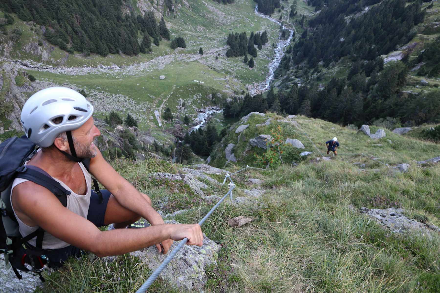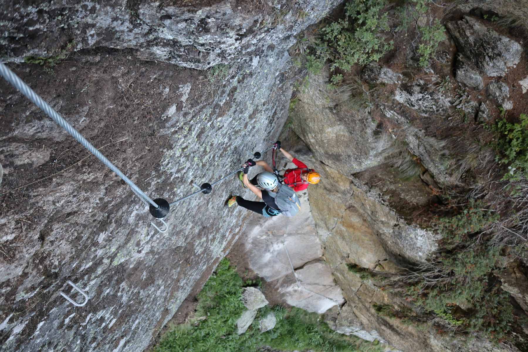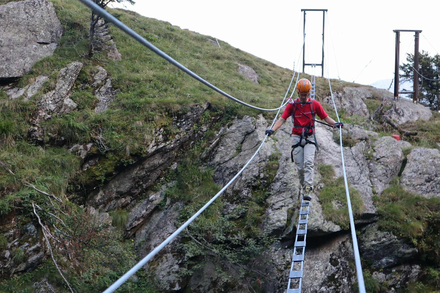 Das erste Stück des Klettersteiges führt über eine Platte und eine Felsstufe bis zur Drahtseilbrücke, auf der man den Zielbach überwindet.