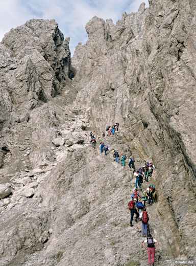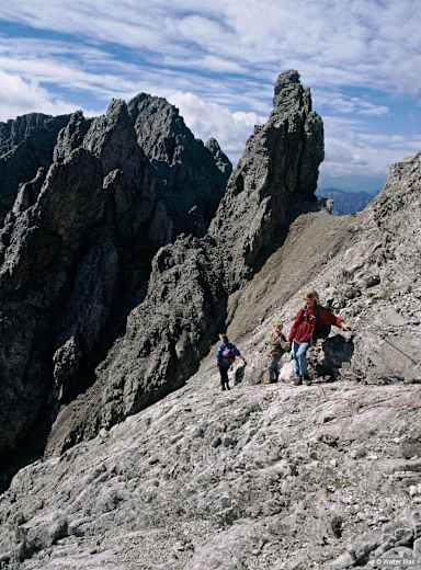Der beliebte Anstieg wird von Zacken und Türmen flankiert, Stahlseile und Eisenbügel entschärfen die Route. Foto: Walter Mair, Rother Bergverlag