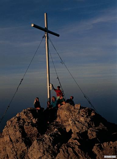 Nach anregender, minder schwieriger Kletterei schauen wir vom Gipfelkreuz auf den 2000 m tiefer gelegenen Lienzer Talboden und in alle benachbarten Berggruppen. Foto: Walter Mair, Rother Bergverlag Bildergalerie (7)