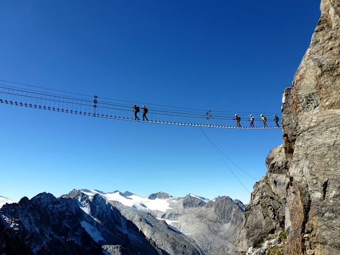 Der technisch anspruchsvolle Klettersteig, der mit luftigen Hängebrücken ausgestattet ist, führt zu den Schauplätzen der alpinen Gebirgsfront im Ersten Weltkrieg.