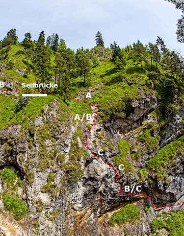 Kurzer, knackiger Sportklettersteig mit traumhafter Aussicht auf den Reintalersee in Tirol. Wer über besonders viel Armkraft verfügt und Klettersteigprfi ist, kann sich sogar in eine Variante mit der Schwierigkeit E wagen. Für die gesamte Klettersteigrunde mit Zustieg, Klettersteig und Abstieg sollte man in Summe 3 h einplanen.