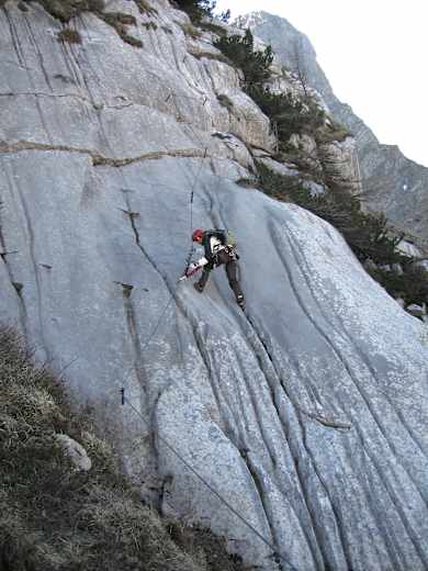 Siehe Topo. Vom Ende der Sicherungen dem Latschensteig folgen und dann entlang der rot/weißen Markierung bergauf zur Cellon-Schulter (ca. 10 Min. vom Ende der Sicherungen).