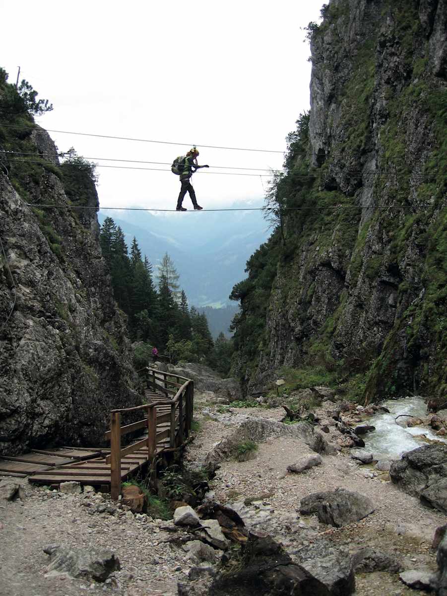 Über eine kurze Felsstufe (B) aufwärts zur Seilbrücke und über diese (B/C) zur gegenüber liegenden Klammseite. Steigverlauf siehe Topo.