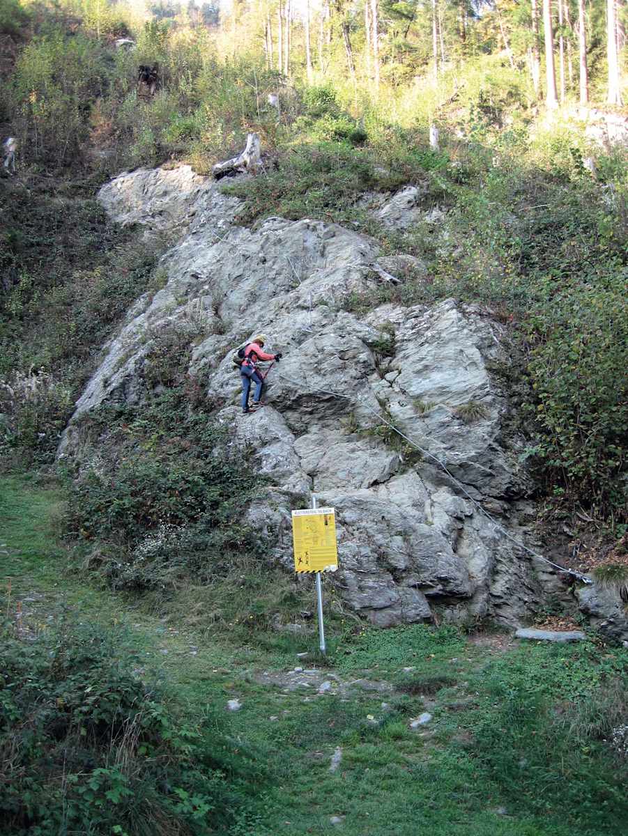 Siehe Topo. Gleich hinter dem Bankerl führt die erste Dreiseilbrücke (20 m, B) über den Bach. Diese kann auch über den Wanderweg von unten her (Holzbrücke) umgangen werden. Nach einem Felsblock (kurzer Übungs-Klettersteig, A) setzen die max. 8 Meter hohen Felswandln der Übungs-Klettersteige an. Diese können in einer aufsteigenden Querung begangen werden, wobei sich die Schwierigkeiten von Felswandl zu Felswandl steigern (siehe Topo, zuletzt sogar eine Stelle E). Es sind mehrere Notausstiege bzw. Umgehungen der Sektionen möglich.