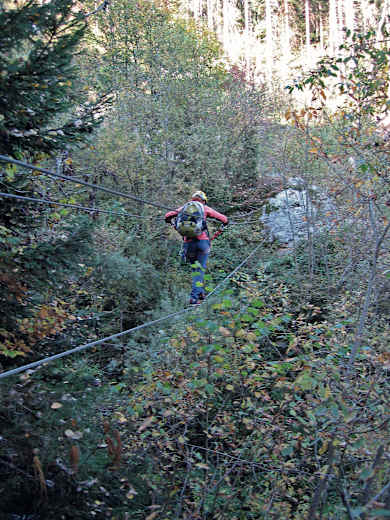 Eine Mutprobe für sich ist die ziemlich wackelige und sehr lange (ca. 30 m!) Dreiseilbrücke zum Schluss, welche sehr eindrucksvoll die Schlucht überspannt. Diese kann man notfalls auslassen und vorher den Klettersteig verlassen. Für Einsteiger und Ungeübte ist der Klettersteig nicht geeignet und verlangt tw. auch ordentlichen Krafteinsatz, verbunden mit meist großer Ausgesetztheit! Der Übungs-Parcour eignet sich gut zum trainieren - wer den letzten Sektor (mit der E-Stelle zum Schluss) ohne große Probleme meistet, kann sich auch den Haupt-Klettersteig zutrauen.