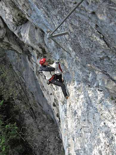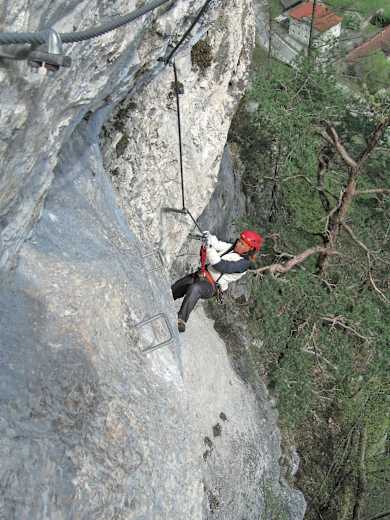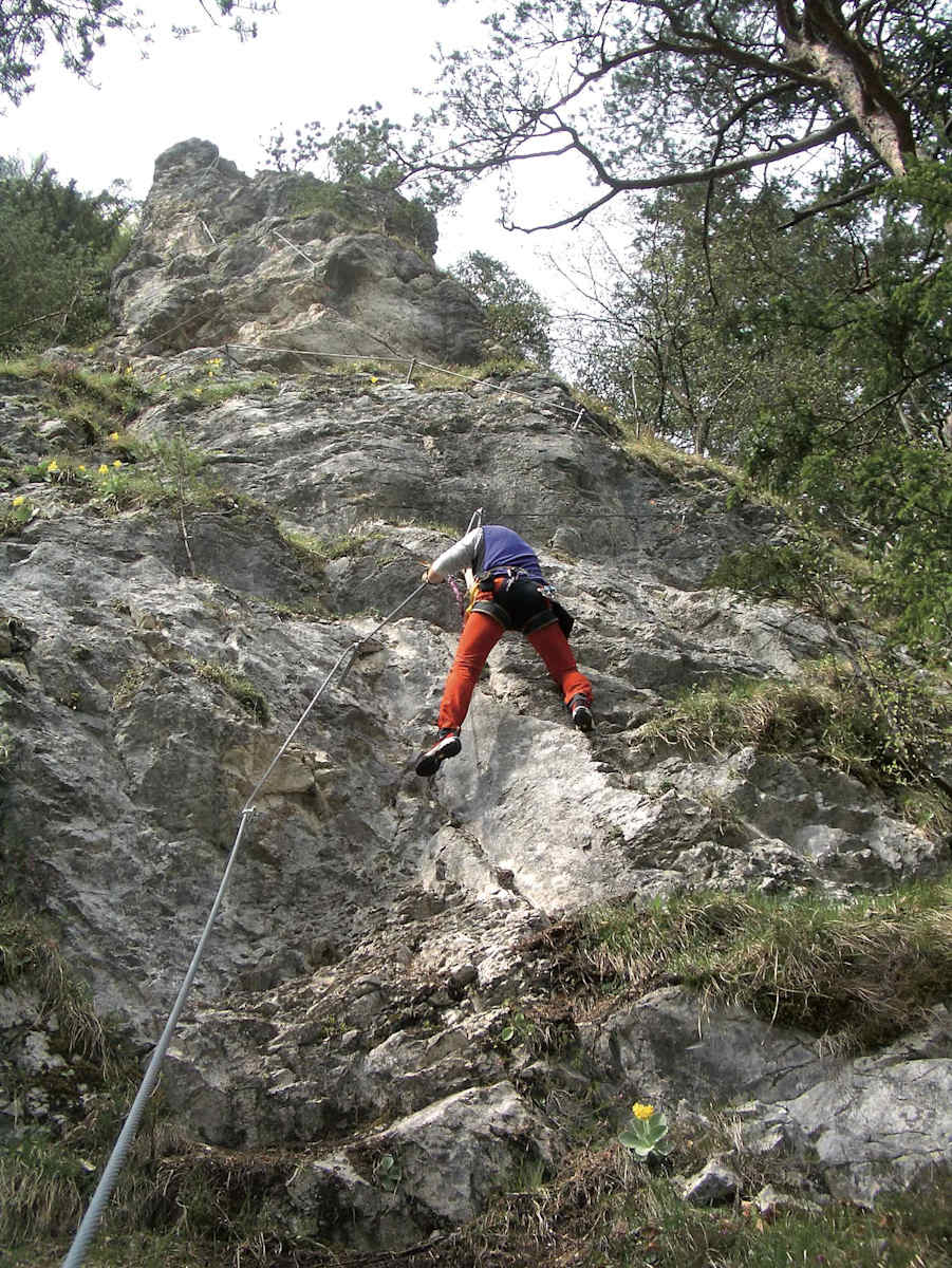 Der Zustieg ist sehr kurz, die Schlüsselpassage in der steilen Hauptwand hat es in sich und ist ziemlich kraftraubend, der Abstieg führt über einen leichten Klettersteig ins Waldgelände.