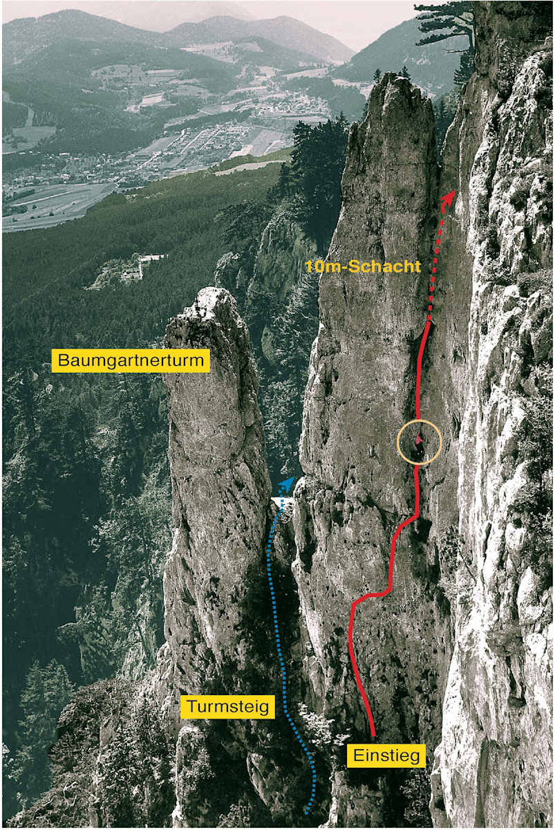 bis 50 Min. a) Über den gelb bez. Wagnersteig zum Wandfußsteig und auf diesem (blau bez.) rechts, entlang der Wände bis zur Abzweigung eines Steiges nach links in Richtung Hochfallwand u. Baumgartnerturm. Anfangs auf blau und rot bez. Weg (vorbei am Einstieg zum Gebirgsvereins-Klettersteig), dann entlang der roten Markierung aufwärts zum Wandfuß (Beginn des Turmsteiges; blasse E.-Aufschrift „T+W“). Wenige Meter rechts davon über gestuften Fels (1) in Kürze zu den ersten Klammern des neuen Einstiegs.
