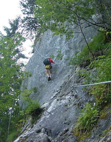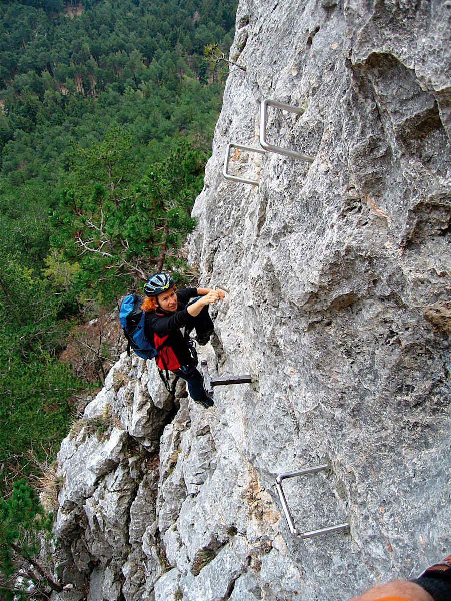 Besonders lohnender, steiler und schwieriger Klettersteig an der Hohen Wand in Niederösterreich, der auch sehr originelle Stellen aufweist (senkrechter u. sehr enger 10 m - Schacht). Nur mit Klammern gesichert (keine Stahlseilsicherung vorhanden!), die an einigen Stellen sehr weit voneinander entfernt sind (oft zu weit für Klettersteigsets - Verlängerung mit Schraubkarabiner mitnehmen!).