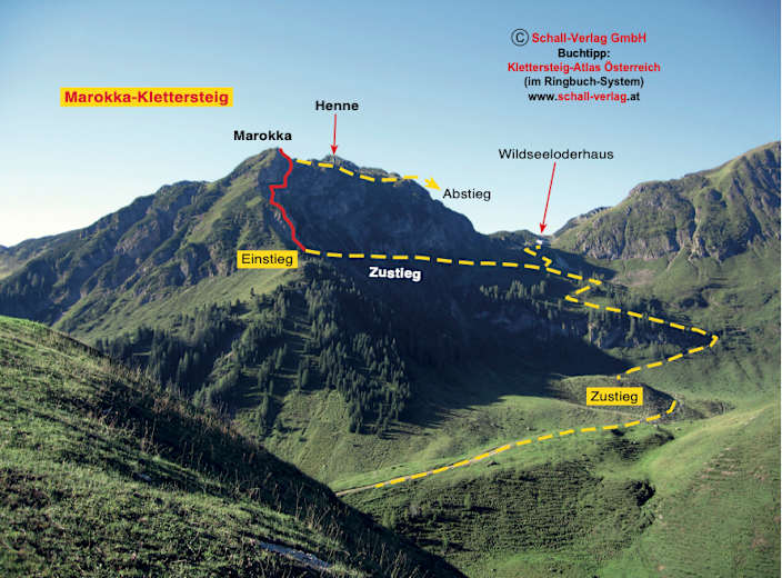 Der Marokka-Klettersteig ist auch für sportliche Einsteiger und talentierte Kinder möglich, sollte aber aufgrund des tw. grasigen Geländes keinesfalls bei Nässe begangen werden. Da besteht vor allem auch beim Zustieg Abrutschgefahr!