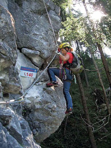 Dabei wurden ein paar, von unten kaum zu erkennende, Felsstufen und Wandln im Wald „gesucht“ und zu einem eher mäßig attraktiven Klettersteigparcour verbunden.