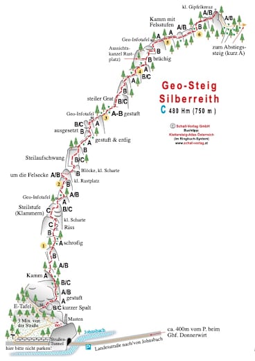 Vom Donnerwirt am Ortseingang des Bergsteigerdorfes Johnsbach entlang der Straße talauswärts, nach dem Tunnel rechts (Tafel „Geo-Steig Silberreith“) und am Steig zum Einstieg.