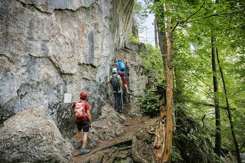 Vom Ausstieg über steile Felsen und ein abschüssiges Felsband bergab (Klettersteigausrüstung erst danach ablegen). Markierungen und Wegweiser weisen auf den Abstieg über einen Waldsteig, einen Fahrweg und eine Straße hinunter zum Donnerwirt hin.