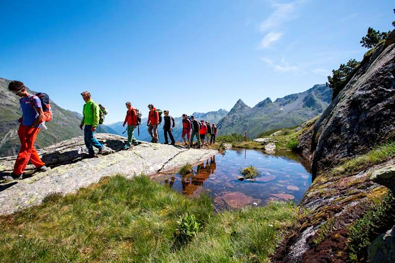 Zustieg zur Wand In Galtür startend, fahren Sie mit der Alpkogelbahn auf die Bergstation. Ein mit roten Holzpflöcken markierter Weg in südlicher Richtung leitet Sie nach kurzer Zeit zum Einstieg. Dauer ca. 5 Minuten