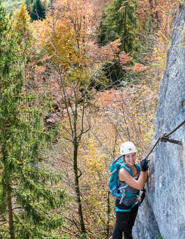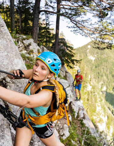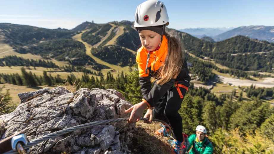 Hier können Klettersteigneulinge erste Höhenluft schnuppern. Bei Schwierigkeitsgrad B/C und einer Aufstiegsdauer von ca. 45 Minuten werden Groß und Klein locker ans Ziel gelangen. Zu Fuß geht’s über die Forststraße in Richtung Bergsee zum Einstieg des Steigs. Der gesamte Steig erstreckt sich über drei Felspartien und lässt Kletterherzen höherschlagen. Zusätzlich sorgen Seile und einfache Steighilfen für die nötige Sicherheit und ein faszinierendes Kletter-Erlebnis.