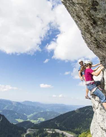 Auf dem Bergmandl-Klettersteig am Hochkar können Klettersteigneulinge erste Höhenluft schnuppern. Bei Schwierigkeitsgrad B/C und einer Aufstiegsdauer von ca. 45 Minuten werden Groß und Klein locker ans Ziel gelangen.