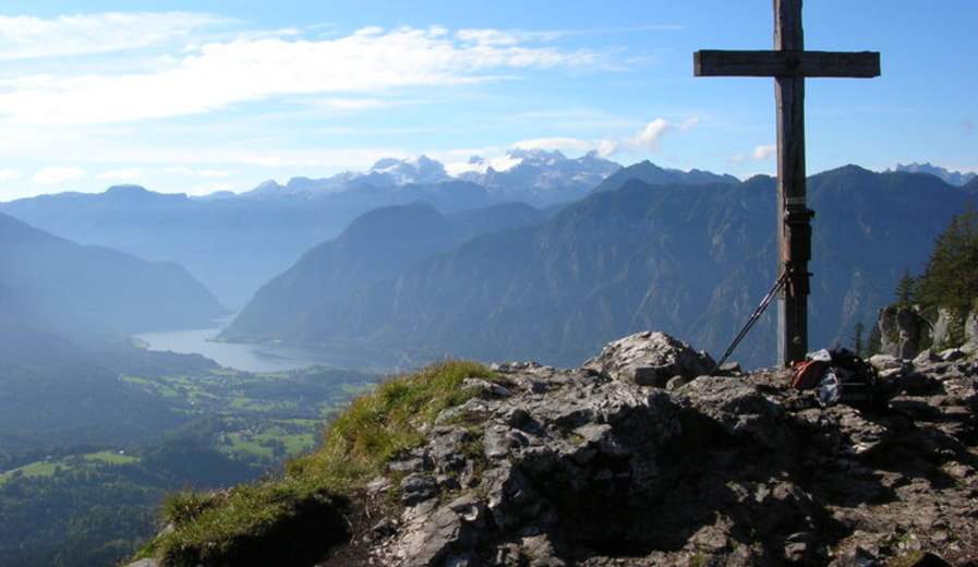 Wunderschöne Aufnahme vom Predigstuhl Gipfelkreuz in Bad Goisern am Hallstättersee bei besten Wetterbedingungen mit dem Hallstättersee und dem Dachstein im Hintergrund Foto: Ferienregion Dachstein Salzkammergut