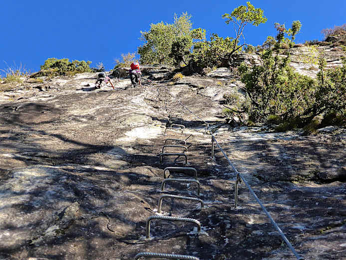 Via Media: Beginnt mit geringer bis mittlerer Schwierigkeit (B bis C) und führt vom Einstieg zur Abzweigung der Via Difficile (markiert durch einen Wegweiser). Anschließend steigt die Route in mittlerer Schwierigkeit (B/C bis C) entlang der südöstlichen Gratrippe an.