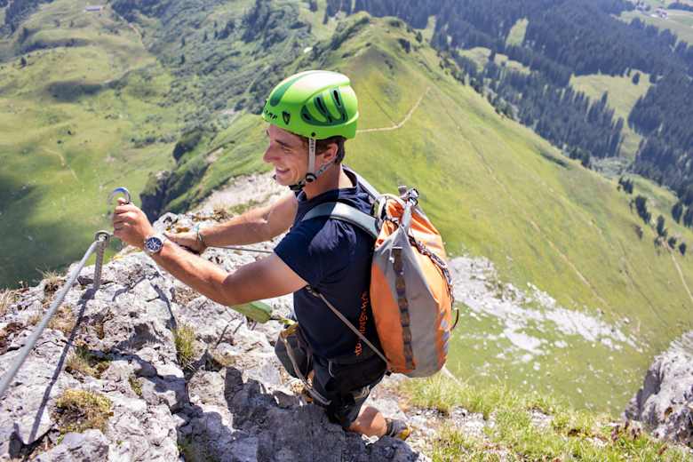 - Mit einem geprüften Klettersteigset und der dazugehörenden Fallbremse
