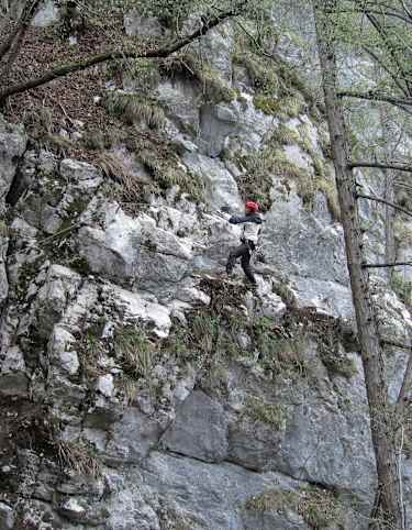 Zunächst über leichten Felsen (A) am Einstieg hinauf zu einer ersten kurzen Stufe, die rasch überwunden wird (B/C). Nun folgt eine Querung in teils erdigem Gelände (B), welches zum ersten Steilaufschwung führt (A). Eine kurze Verschneidung (B/C) ergibt den Übergang in die mit Klammern entschärfte, sehr steile und glatte Wand (C). An deren Ende folgt eine Querung auf glattem Fels (B/C bis C) zur Schlüsselstelle. Ein scharfes und sehr ausgesetztes Eck muss überwunden werden (C/D), welches teilweise mit Klammern zusätzlich gesichert ist. Dann noch ein paar Meter auf der ausgesetzten und steilen Kante (C), welche im Wald-/Schrofengelände ausläuft. Noch kurz im abschüssigen Gelände (A/B) bis kurz unterhalb des Kirchleins. Auf einem Steiglein in wenigen Min. zur Dreifaltigkeitskirche.