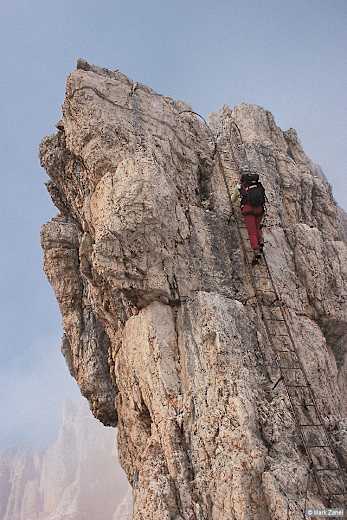 Letzterer zieht nach rechts auf einer Art Riesentreppe mit großen Absätzen höher. Über die einzelnen Aufschwünge helfen solide Sicherungen, teils auch Leitern (maximal B/C). Nach rund 300 Hm schwenkt man von der Nordschulter der Cima Brenta auf das ostseitige Garbariband, das den Gipfelaufbau in luftiger Höhe schneidet (der Abzweig zum Gipfel – Stellen I bis II in freier Kletterei! – befindet sich oberhalb einer Stufe). Von seinem Ende über Leitern steil abwärts (B/C) zur berüchtigten Eisrinne, die inzwischen mehr und mehr ausapert und mittels lockerem Seil überbrückt wird (trotzdem je nach Verhältnissen ein prekäres Hindernis). Weiter geht es auf mustergültigen Bändern quer durch atemberaubende Wände mit eingelagerten Nischen, dann um ein Eck zur Felsschulter der Spalla di Brenta (3.002 m): höchster Punkt des gesamten Bocchetteweges. Exponierte Gratpassagen im Bergab (B mit Leiter) und ein verwinkelter Verlauf um einen Zacken in der Bocchetta Alta dei Massodi schließen auf zur langen, fast senkrechten „Scala degli Amici“, die uns bis knapp an die Dreitausendermarke zurückbringt (B/C). Jenseits des schuttbedeckten Spallone dei Massodi (2.999 m) wird der Abstieg zur Bocchetta dei Massodi eingeleitet, teils gestuft, teils über schuttbedeckte Bänder, von einem Absatz nochmals über Steilgelände mit mehreren Leitern (meist um B). Zwischendurch kann man auf die waghalsige Variante des Sentiero Detassis abzweigen, dessen ultralange und teils überhängende Leiternserie („Scala degli Dei“«, bis C) jedoch nicht jedem behagen dürfte. Da zieht der Rucksack ganz schön nach außen! Diese Route führt in den engen westseitigen Kessel, aus dem man um die Nase der Gemelli herum zum Rifugio Alimonta gelangt. Empfehlenswerter erscheint jedoch, nach der Gabelung den Quergang über eine Felsleiste (C) in die Bocchetta dei Massodi (2.790 m) zu vollziehen und aus dieser heraus nochmals kurz aufwärts zu klettern (B). Man erreicht die Geröllschulter der Cima Molveno und steigt drüben über letzte gesicherte Stufen bis zum Rand der Vedretta dei Sfúlmini ab. Von dort rasch zu den flachen Steinbänken, auf denen das Rifugio Alimonta platziert ist.