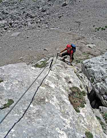 Üppig gesicherte, verwinkelte Route, die an der 3000-Meter-Linie kratzt, also streng hochalpinen Charakter trägt. Immer wieder Leitern, teilweise exponiert, auf der Variante des Sentiero Detassis sogar extrem. Eispassagen können Ausrüstung notwendig machen; große Bergerfahrung generell wichtig.