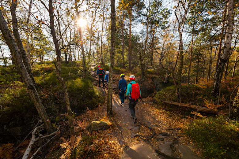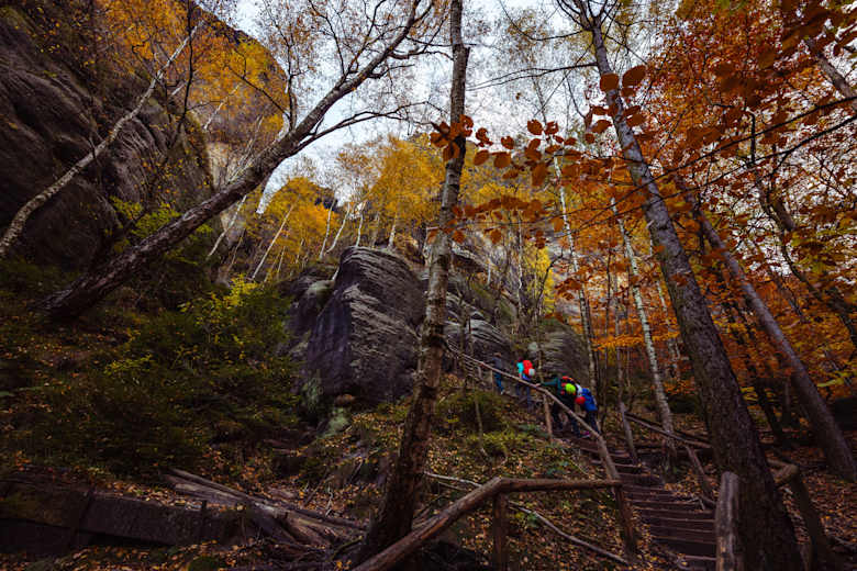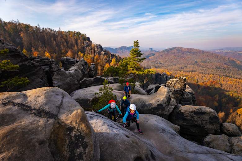 Auf dem Weg zum Einstieg des Häntzschelstiege-Klettersteig an den Affensteinen Foto: Hannes Tell / Red Bull Media House Publishing