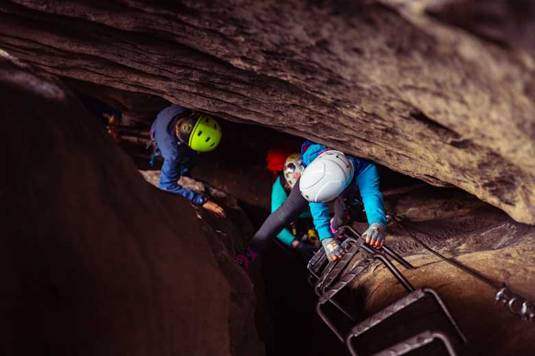 Enger Kamin des Häntzschelstiege-Klettersteig an den Affensteinen Foto: Hannes Tell / Red Bull Media House Publishing
